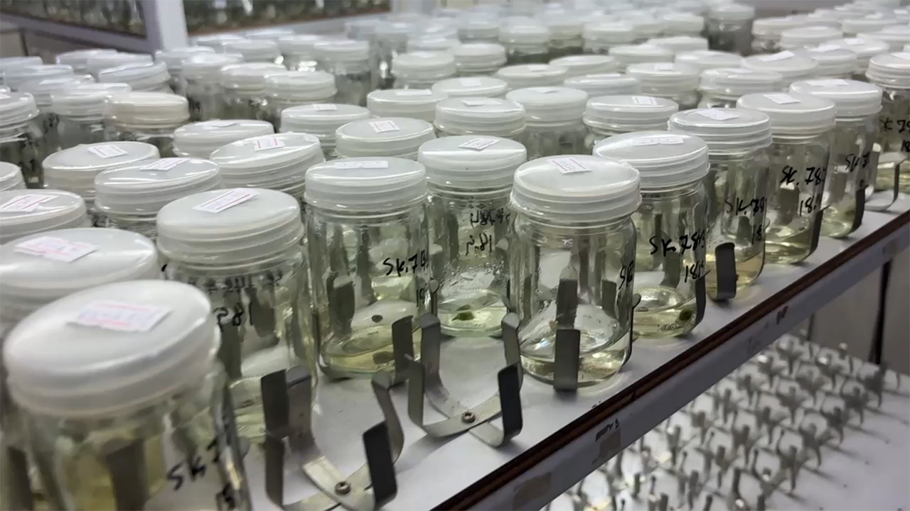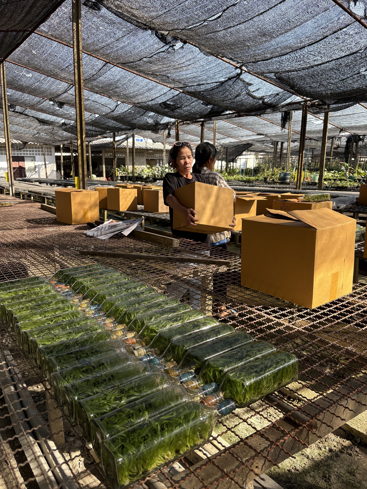 Export-ready orchid tissue culture flasks at Kanjarin Nursery, Thailand.
