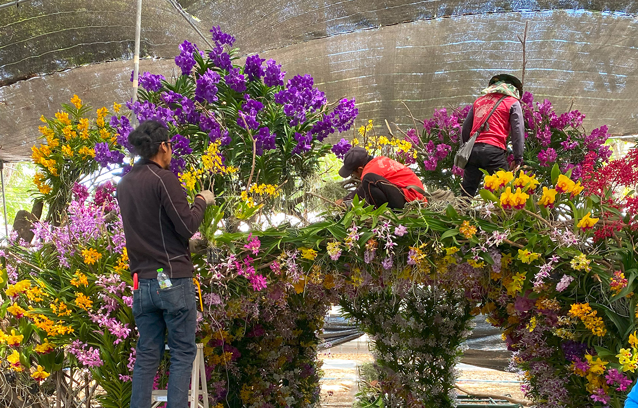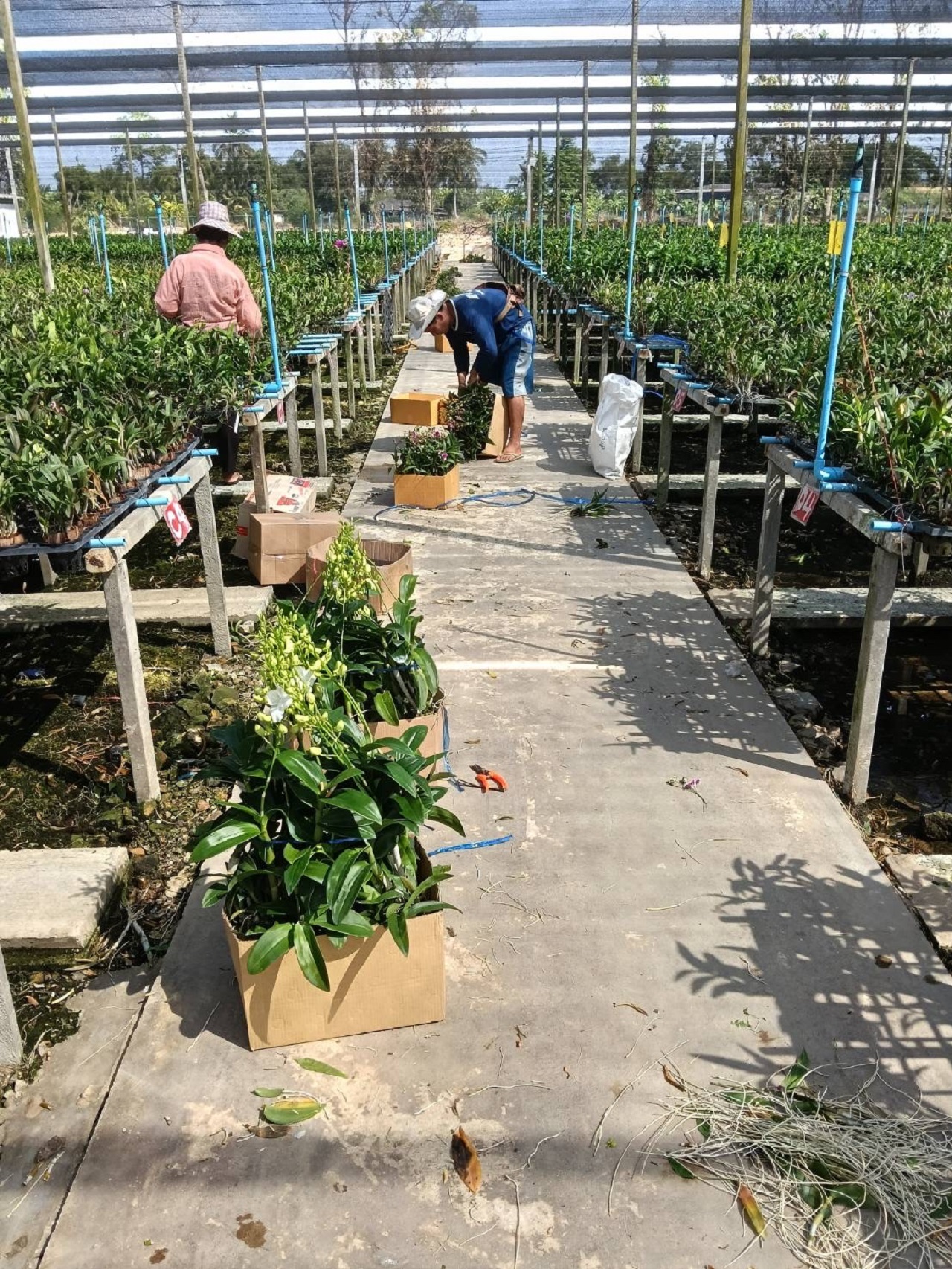 Wholesale orchids being prepared for export at Kanjarin Nursery in Thailand, featuring healthy plants grown under shade-house conditions