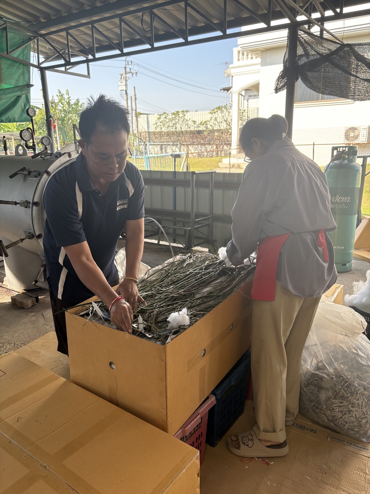 Packing bare-root orchids for export at Kanjarin Nursery in Thailand, showcasing professional wholesale orchid shipping process